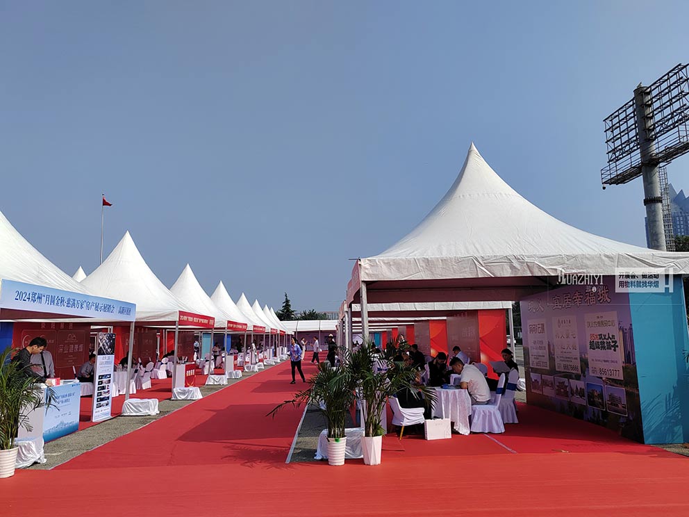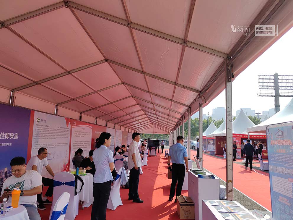 鄭州會展中心房展會現(xiàn)場的尖頂篷房和桌椅由華熠公司提供