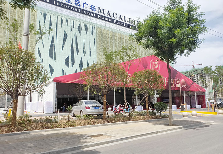 華熠篷房租賃人員快速的為您搭建出紅色大篷房,如圖我們可以看到,一座紅色的大篷房屹立在紅色美凱龍家具生活廣場,篷房租賃是目前當(dāng)下比較流行的一種使用方式,它作為一種移動性建筑,對氣候也有著較強的適應(yīng)能力。因為篷房的內(nèi)部沒有多余的支柱,空間使用率大,靈活的內(nèi)部空間,可以讓顧客們有更好的體驗,還可以達到更好的展示效果。