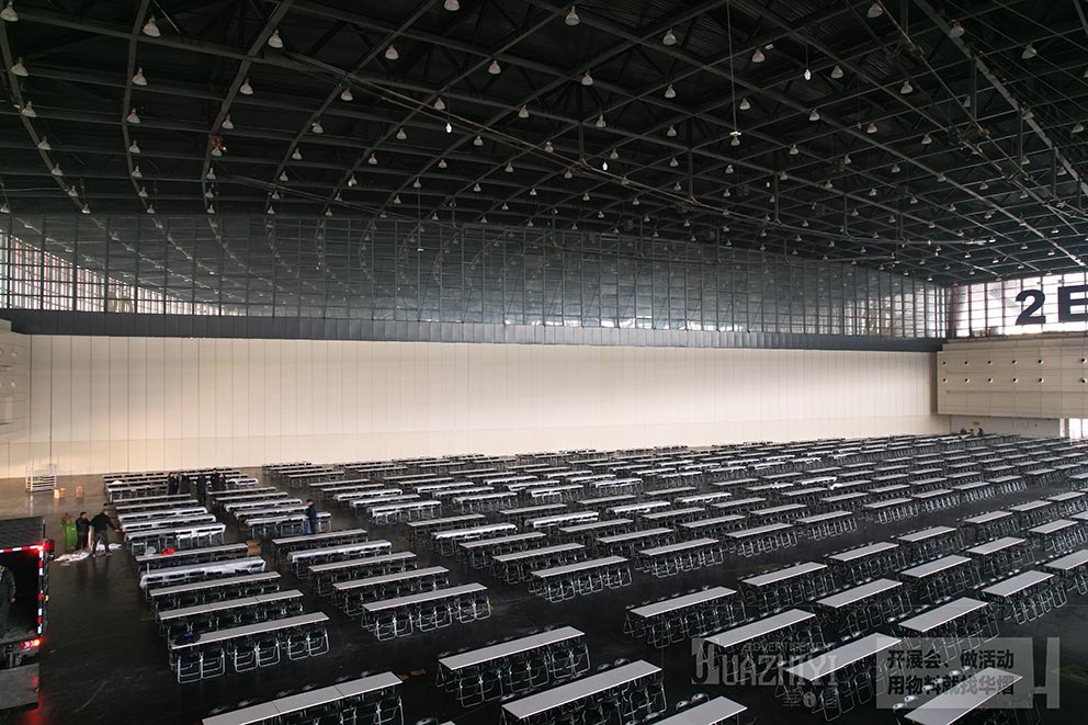 會(huì)展中心長條桌折疊椅出租現(xiàn)場(chǎng)直拍,請(qǐng)隨華之熠廠家一起走進(jìn)鄭州會(huì)展中心場(chǎng)館內(nèi),看看此次為活動(dòng)助力提供的長條桌和折疊椅吧。