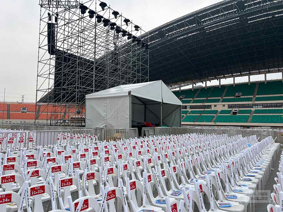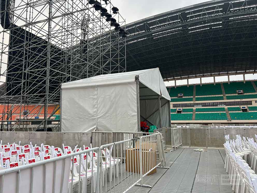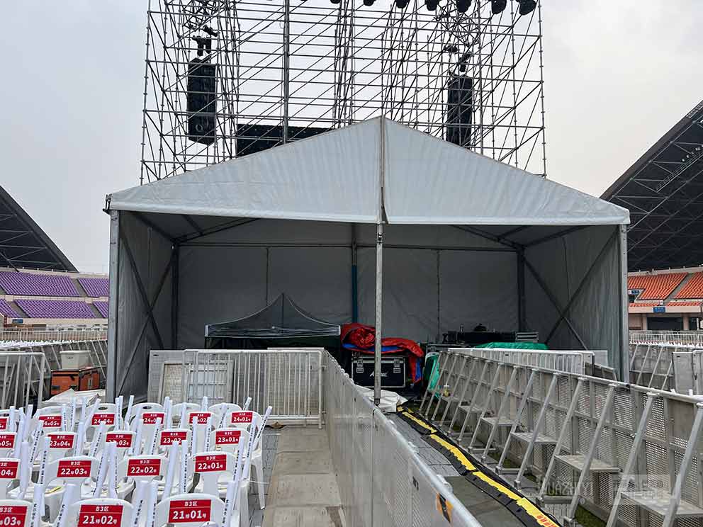 從現(xiàn)場(chǎng)實(shí)拍照片中可以看到,這座演藝篷房氣勢(shì)恢宏,結(jié)構(gòu)穩(wěn)固。篷房外觀采用了現(xiàn)代簡(jiǎn)約的設(shè)計(jì)風(fēng)格,線條流暢,色彩搭配和諧,與演唱會(huì)主題相得益彰。篷房?jī)?nèi)部空間寬敞,能夠容納大量設(shè)備,保護(hù)了設(shè)備不會(huì)因突發(fā)天氣狀況而出現(xiàn)問題。