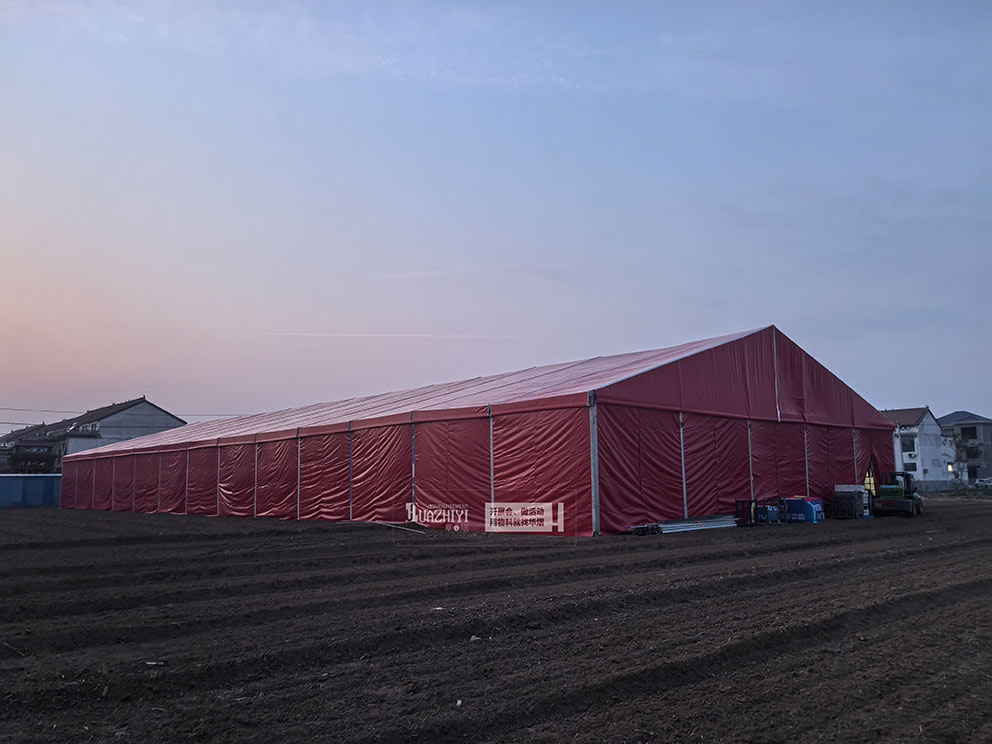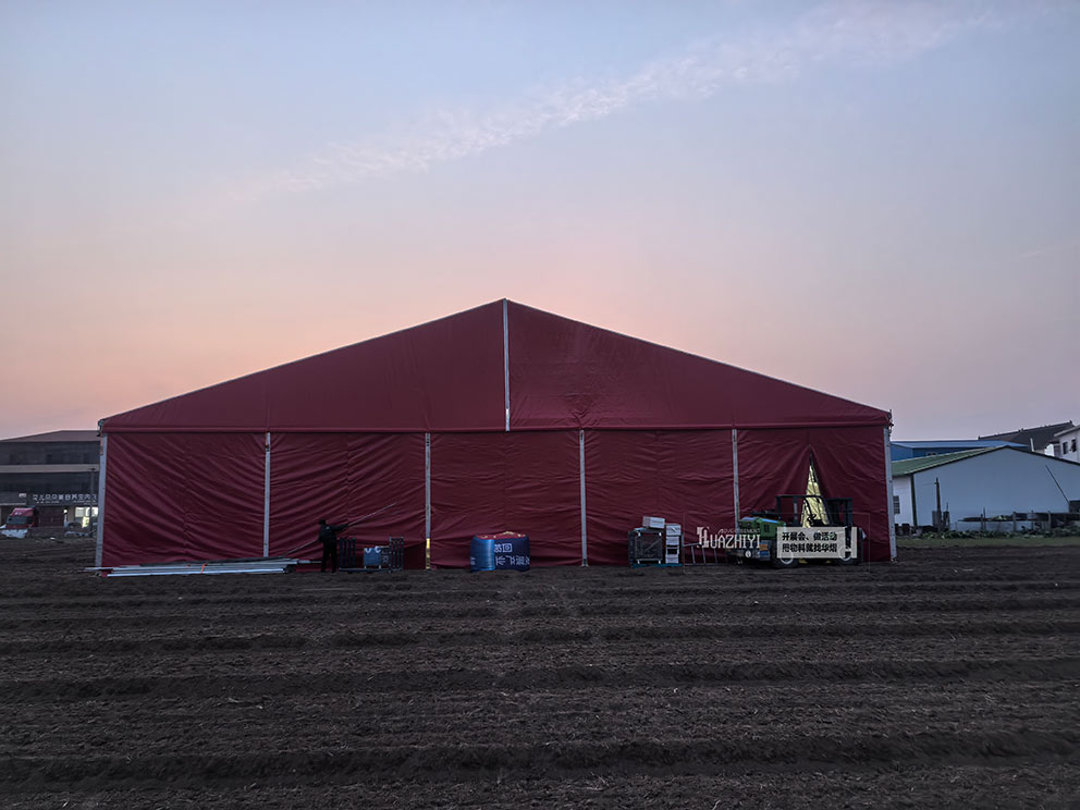 鄭州篷房出租搭建一座紅色喜宴婚慶篷房租賃現(xiàn)場