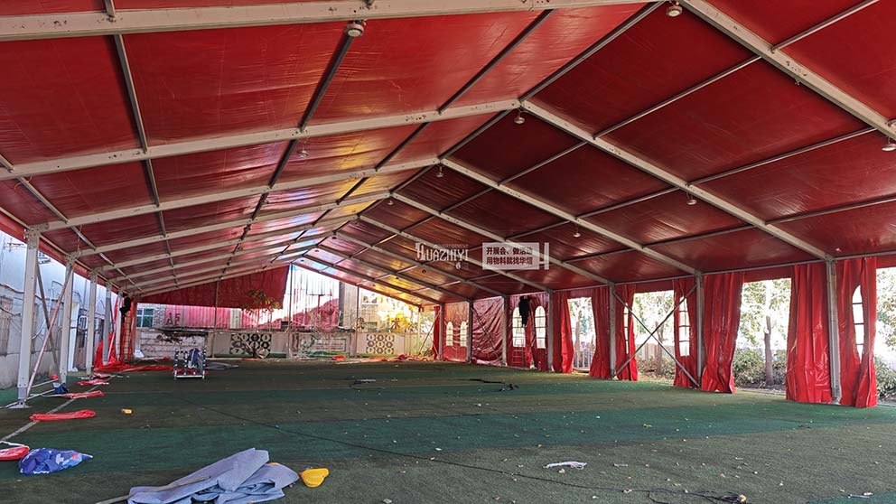 紅色婚宴婚禮篷房的設(shè)計(jì)充滿喜慶氛圍,大紅色的篷布在陽(yáng)光下熠熠生輝,為婚禮增添了幾分莊重與熱烈。篷房?jī)?nèi)部空間寬敞,可以根據(jù)新人的需求進(jìn)行靈活布置。無(wú)論是浪漫的燈光、優(yōu)雅的舞臺(tái),還是精致的裝飾,都能在這里得到完美的展現(xiàn)。